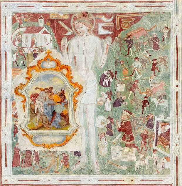 I want to begin today’s post by calling attention to a different but related iconographic tradition. It’s usually called “Christ among the trades,” because it displays an image of a suffering Christ surrounded by all kinds of tools: axes, hoes, mattocks, scales, shovels, shears, shuttles, and looms. Sometimes called Sunday Christ or St. Sunday, these wall paintings were most popular in England in the second half of the 14th century, where they decorated dozens (if not hundreds) of parish churches across rural England. By the beginning of the 17th century, nearly all of the St. Sunday wall paintings had been destroyed or covered over in whitewash. They are usually crude by modern standards, but they were clearly very important to lay people. Here’s a deluxe and well-preserved example from Italy: